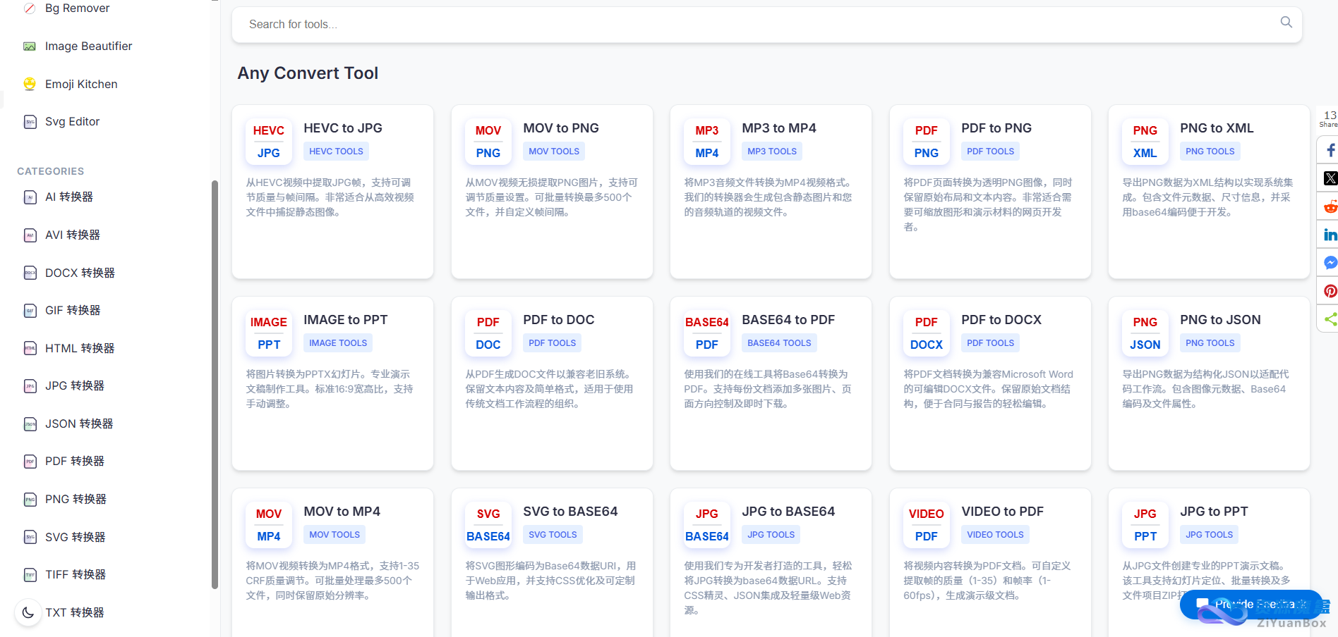 - 图片处理:JPG/PNG ↔ WebP/SVG/BMP,支持透明背景与批量压缩。